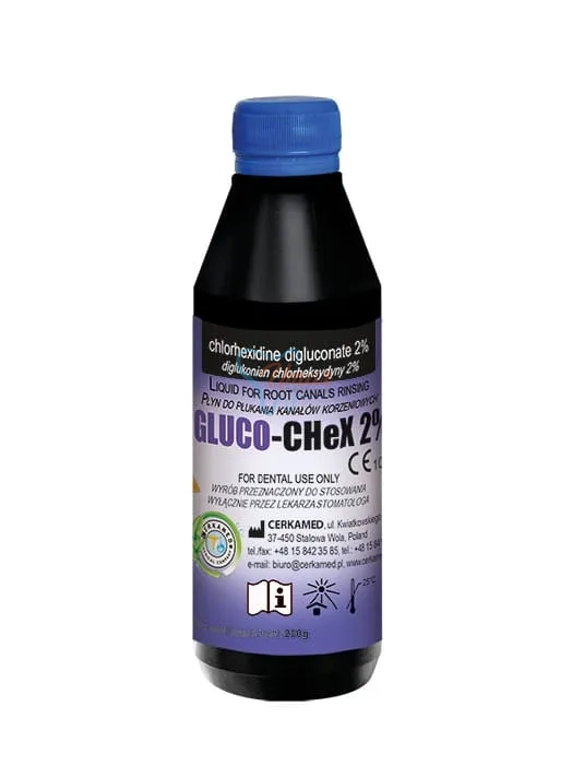 GlucoChex 2% Chlorhexidine Gluconate from industry leaders in Endodontic Irrigation & Disinfection Cerkamed.Cerkamed Chlorhexidine Digluconate 2% is a dental solution primarily used as an antimicrobial irrigant during endodontic (root canal) treatments. It is designed to disinfect root canals by eliminating bacteria and other pathogens that could cause infection. Chlorhexidine is particularly effective against Gram-positive and Gram-negative bacteria, as well as certain fungi, making it valuable in reducing bacterial load in hard-to-reach areas of the root canal system.