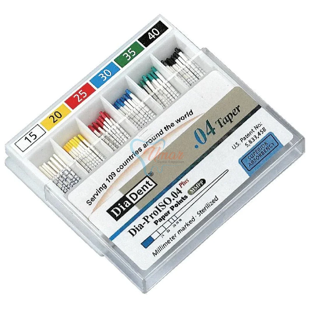 DiaDent Colour Coded Paper Points are made from specially formulated, highly absorbent paper. Each of the Paper Point is individually hand-jig rolled to ensure perfect size and firmness. DiaDent Paper Points have been awarded the ISO 9001 and CE Certification insuring, a high standard of design, manufacturing, and quality assurance.