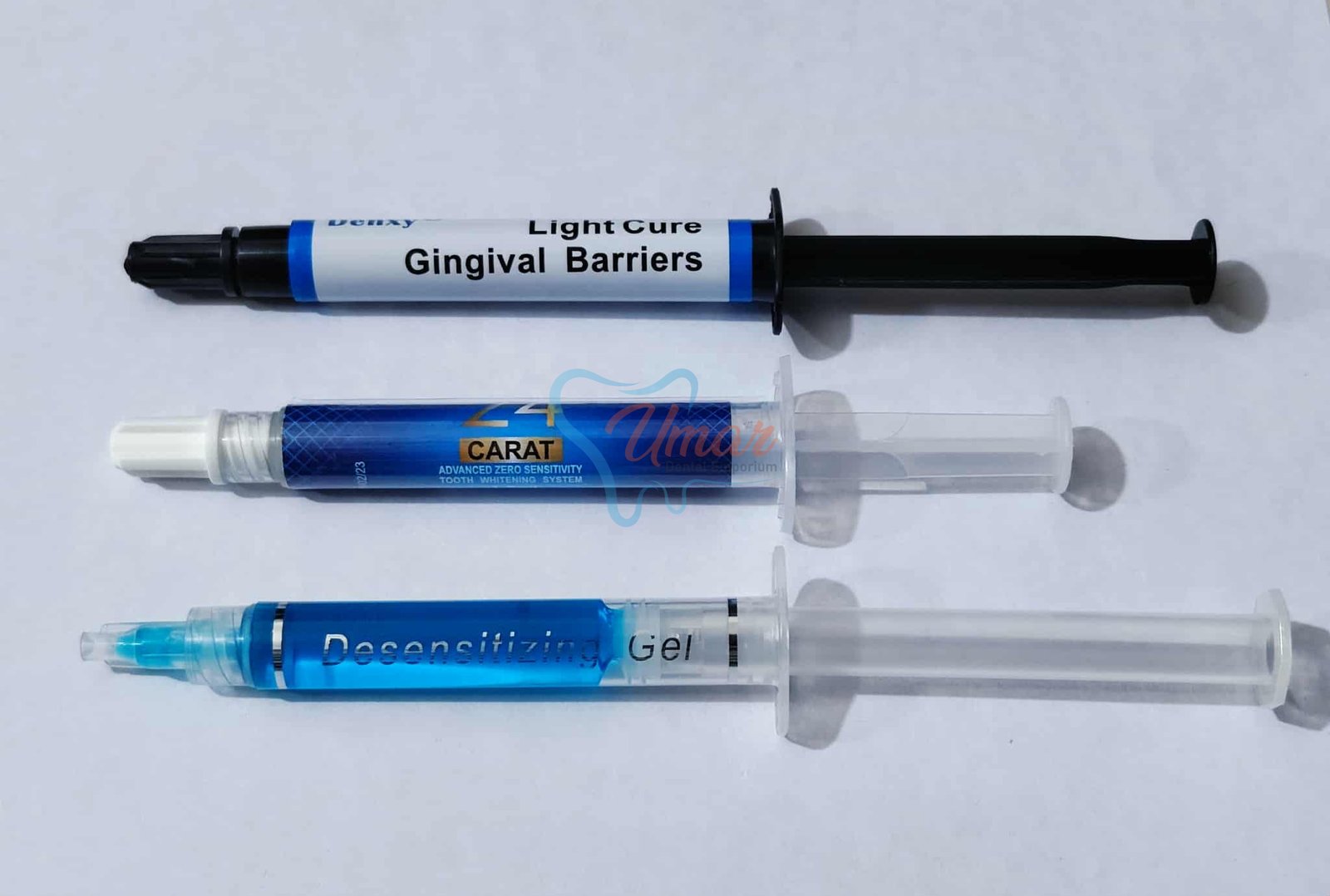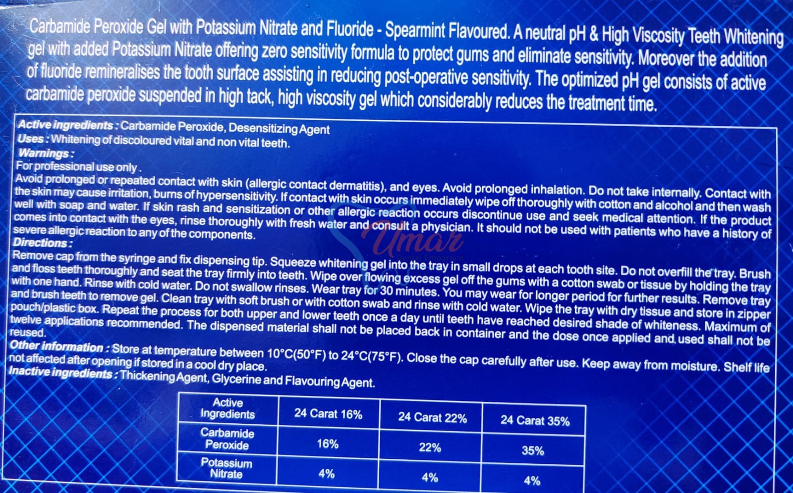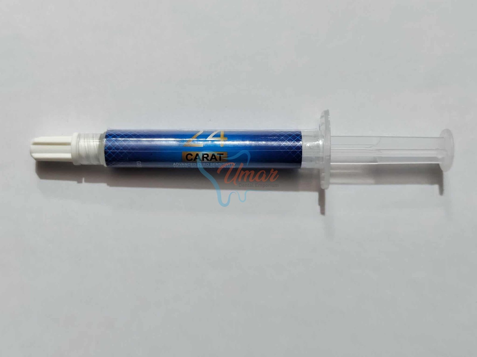 24 Carat is a revolutionary, state-of-the-art, teeth whitening gel. Its advanced zero sensitivity formula eliminates sensitivity. The optimized pH gel consists of the active carbamide peroxide-glycerine combination suspended in a high tack, high viscosity gel which considerably reduces the treatment time.