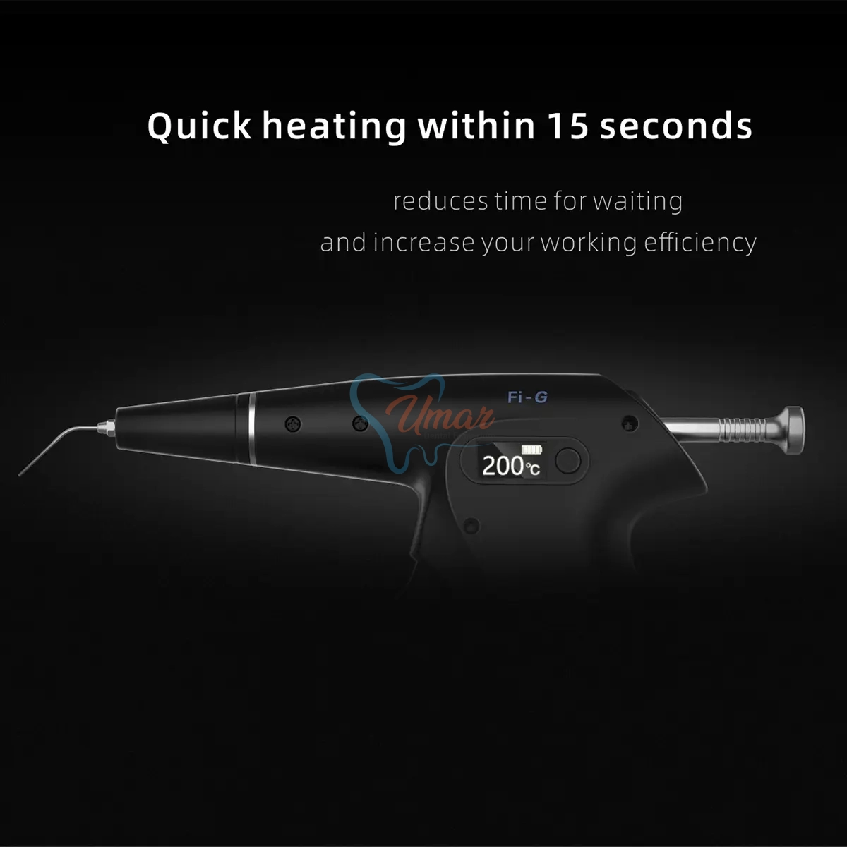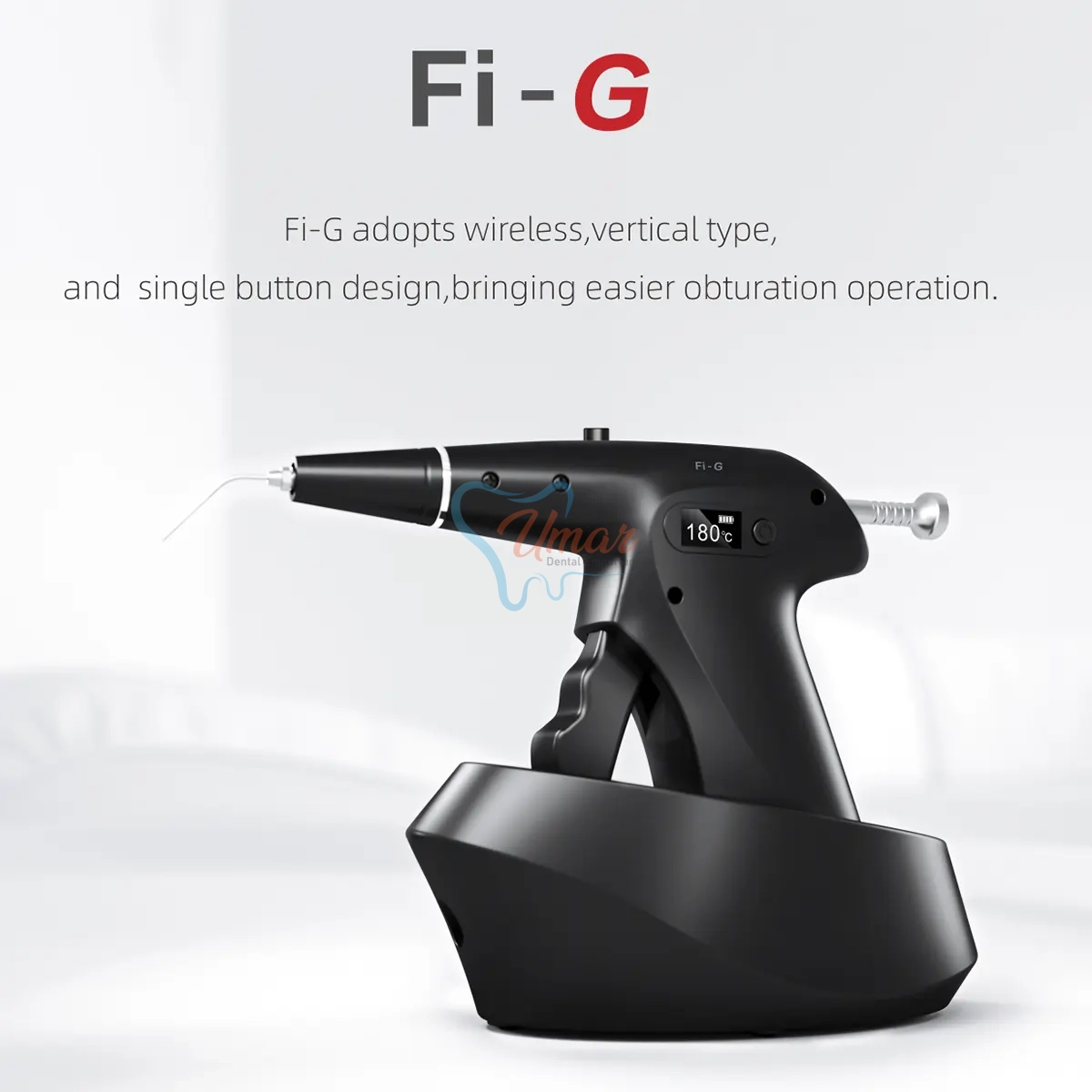 The Woodpecker Fi-G Gutta Percha Obturation Gun utilizes one-touch wireless dispensing for melting and filling of gutta percha.